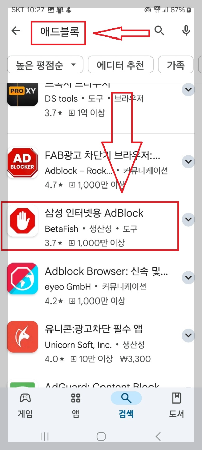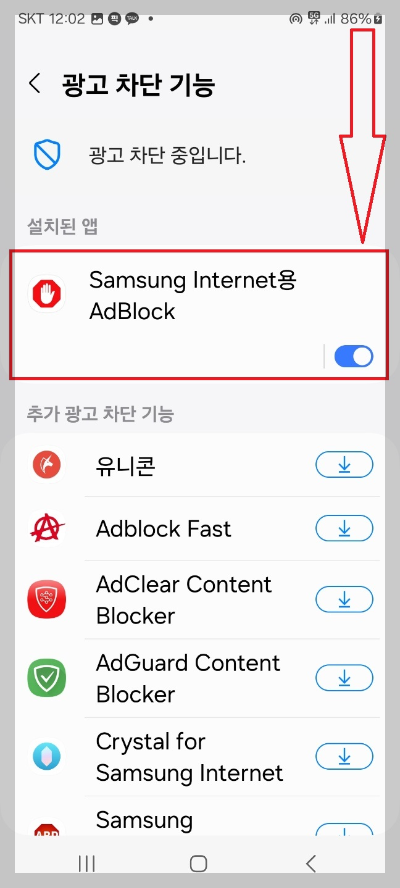 구글 플레이 스토어에서 '애드블록'을 검색하여 삼성 인터넷용(AdBlock) 앱을 설치해 주세요.
