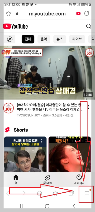 삼성 인터넷 브라우저로 유튜브에 접속 우측 하단에 있는 메뉴(≡)를 터치한 후,