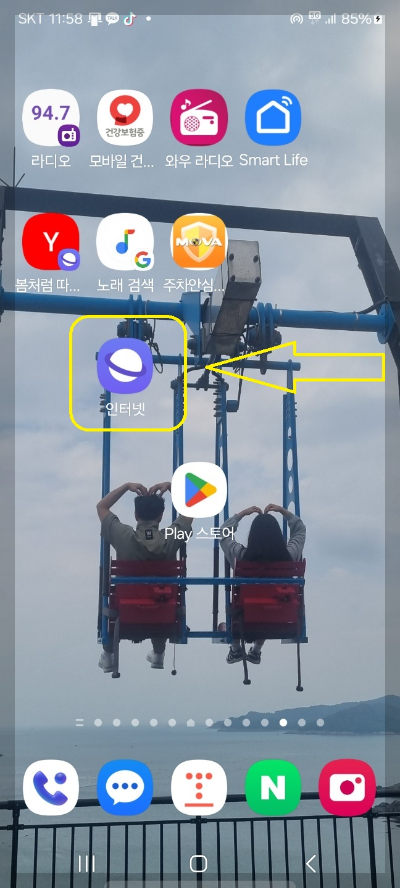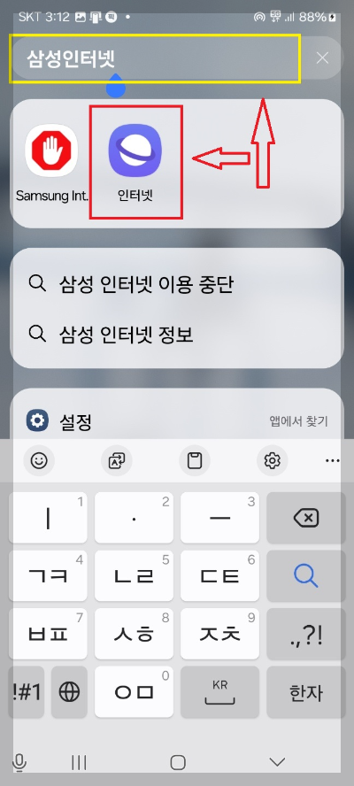 삼성 인터넷이 바탕화면에 없다면 손가락을 화면에 대고 위로 올려서 검색창에 삼성 인터넷을 검색