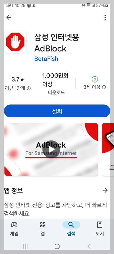 '삼성 인터넷 애드블록' 기능을 켜면 더욱 강력한 광고 차단 효과를 경험하실 수 있습니다.