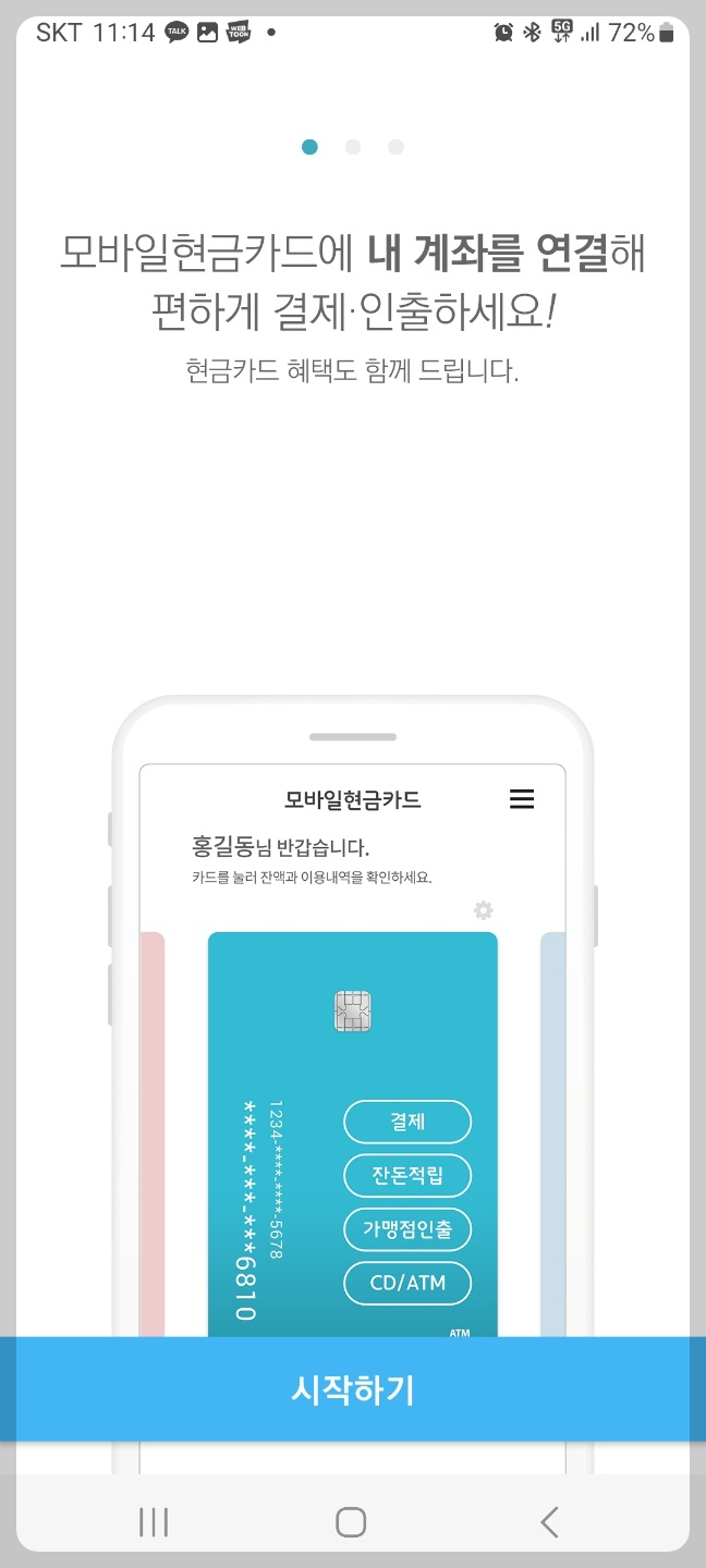 구글 스토어나 앱스토어에서  "모바일 현금카드 앱"을 다운받아 은행 계좌와 연동하면 되는데요.