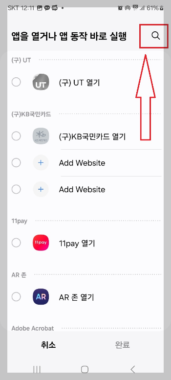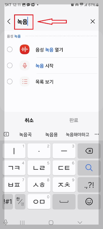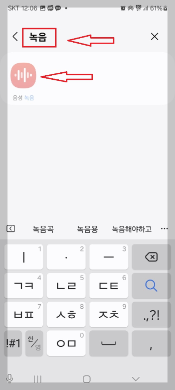 6. 앱을 열거나 앱 동작 바로 실행을 선택하시고요. 역시 상단에 녹음을 검색합니다.