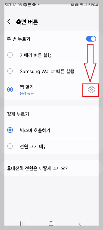 2. 해당 화면에서 두 번 누르기를 선택하시고 세 번째 앱 열기에서 우측 톱니바퀴를 선택해 줍니다.