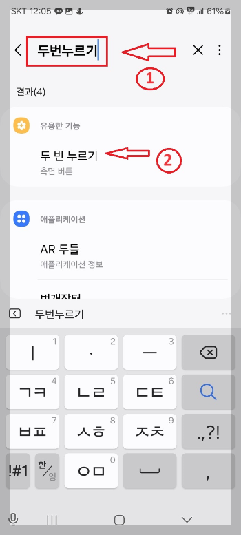 1. 화면을 아래로 쓸어내린 후 설정 앱을 열고 '두 번 누르기'를 검색합니다.