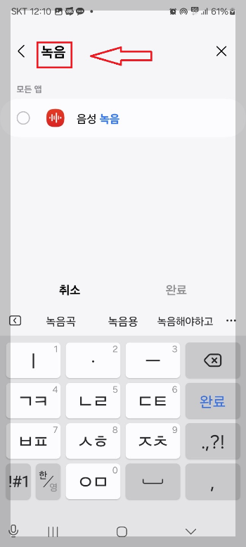 4. 상단에서 녹음을 검색하시고 선택해 주고 완료해 줍니다.