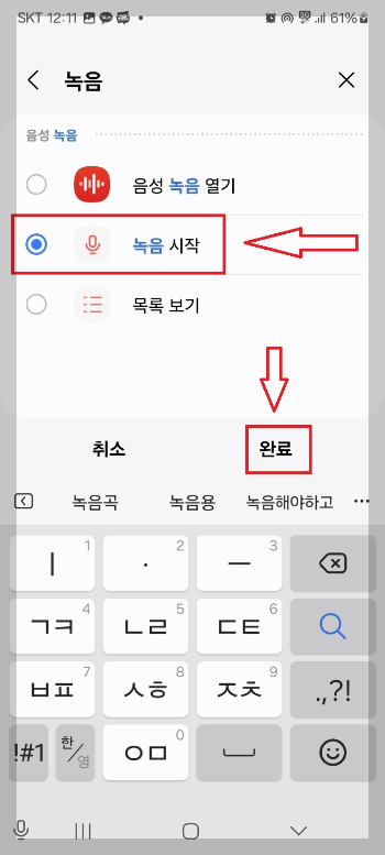 7. 녹음 시작을 선택해주고 완료를 눌러줍니다. 그리고 저장해 주시면 됩니다.