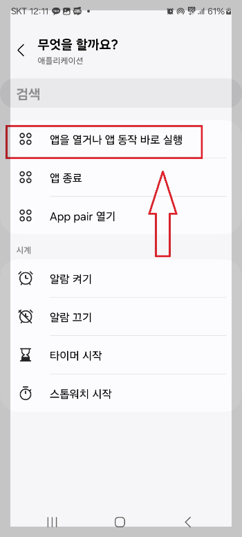 6. 앱을 열거나 앱 동작 바로 실행을 선택하시고요. 역시 상단에 녹음을 검색합니다.