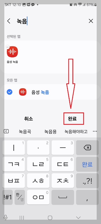 4. 상단에서 녹음을 검색하시고 선택해 주고 완료해 줍니다.